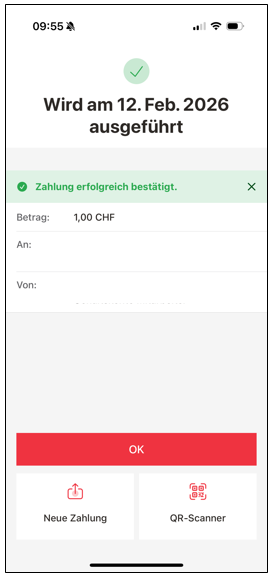 Nach der Bestätigung einer Zahlung für einen neuen Begünstigten in der App, wird folgendes Fenster angezeigt: